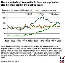 Meat is a major component of American diets. Data from 1960 show the combined annual per capita consumption of beef, pork and chicken at 148 pounds; in 2004, that amount increased to 195 pounds a year.[4] Ground beef made up 42% of the beef market in 2000. Beef consumption, particularly ground and processed beef, is highest in households with incomes at or below 130 percent of the poverty level.