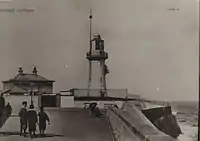 Just south-west of the Heugh, the Old or 'Pilots' Pier has been marked by a lighthouse since 1836. The present wooden structure (painted white with two narrow red horizontal stripes) dates from 1899; the lantern is strikingly topped by a rotating radar. It displays a green light (one flash every three seconds) with a white sector indicating the deep-water channel into the Old Harbour and Hartlepool Docks.[2]