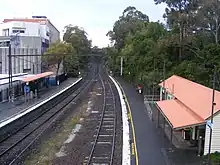 Heyington railway station is a commuter railway station in Toorak, a suburb of Melbourne, Victoria, Australia. The station opened on 24 March 1890 as part of the branch line from Burnley to Waverley Road station.[3] The station consists of two side platforms accessed by a pedestrian bridge. There is one principal station building located on Platform 1. This buildings is single-storey and act as toilet, automated ticketing, and PSO facilities.[4] These buildings were provided in 1975 as part of the station rebuild.[5] The station is the only station in Melbourne to feature stair only access, subsequently making the station fully inaccessible.[6]