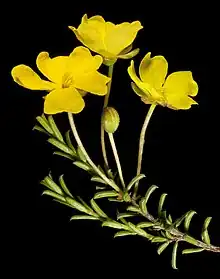 This hibbertia grows in kwongan and heath, mainly between Wagin and the Dragon Rocks Nature Reserve, but it is also widely in the Avon Wheatbelt Esperance Plains, Jarrah Forest and Mallee biogeographic regions in the south-west of Western Australia.[2][3]