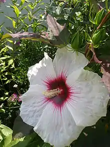 Hibiscus 'Kopper King' is a cultivar of Hibiscus that has large, showy flowers and copper-colored lobed leaves. It was bred and selected for its aesthetic attributes as well as its cold hardiness to at least −30 °F (−34 °C) (USDA hardiness zone 4) by Jim, Bob, and Dave Fleming of Fleming's Flower Fields in Lincoln, Nebraska. 'Kopper King' is a compact perennial shrub, reaching 3–4 ft (0.9–1.2 m) tall with a 2–4 ft (0.6–1.2 m) spread. The leaves are coppery red to dark purple, with a lobed and toothed leaf shape that appears to be similar to some maples. New growth will emerge in late May or early June and the plant will bloom from midsummer to early fall at the first frost. Each flower, with its cream to light-pink petals and deep red eye in the center streaking outward toward the margin, is borne singly from the leaf axils and can be 8–12 in (20.3–30.5 cm) in diameter. Each flower only lasts one day but new blooms are typically produced in succession, allowing for almost continuous flowering. The flower display is flat with petals overlapping. Overall, the plant is resistant to pests and diseases, although it can be severely damaged by Japanese beetles.[1][2]