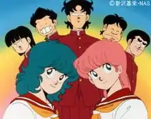 - ↑ Anime High School! Kimengumi, episode 57A (00:03-07) or manga High School! Funny-face Club, vol. 4, p. 151. Their shop sign says "Always Freshly Baked, Bakery & Cake Daima" (anime) or "Daima Cake Shop" (with an illustration of cake and tea) (manga).