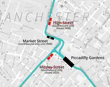 - ↑ Shudehill tram stop did not open until 2003, and so the next stop for northbound trams after High Street was Manchester Victoria station