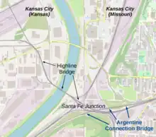 - ↑ "The Milwaukee Road in Kansas City". The Milwaukee Road - Kansas City Subdivision. Retrieved 15 April 2022. [Junctions identified near the Highline: UP, AT&SF, KCS, KCT, MKT, SLSF, MP ]