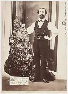 What is now Hill End was originally a part of the Tambaroora area; Tambaroora town was a few kilometres to the north of present-day Hill End. In the 1850s the Hill End area was known as Bald Hills. In 1860 a village was proclaimed, first as Forbes, then in 1862 it was altered to Hill End.[2] Tambaroora had been the larger centre; in 1865, it had seven public houses to Hill End's two.[3] Following the discovery of rich gold reefs at Hawkins Hill (Hill End), in the early 1870s. Hill End overtook Tambaroora as the main town in the area.[4]