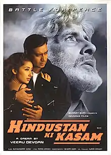 Hindustan Ki Kasam (Swear on India) is a 1999 Indian Hindi-language action film directed by Veeru Devgan and starring his son Ajay Devgn (first movie in a double role), Amitabh Bachchan, Manisha Koirala and Sushmita Sen, along with Kader Khan in a special appearance. For a change actors like Prem Chopra and Shakti Kapoor featured in positive roles. The film was an average grosser, despite taking a bumper opening.[2] The movie broke the opening day record in India at the time of its release and managed to do average business at the box office.[3]