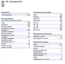 - 1 2 3 "Hinsdale, Montana 2010 Demographics". U.S. Census Bureau. Archived from the original on January 29, 2016. Retrieved January 8, 2015.