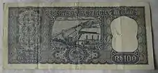 A commemorative stamp on Hirakud Dam was released on 29 Oct 1979 by the Department of Posts, with denomination 30 paise (0.38¢ US), 3,000,000 stamps issued.[17] A hundred rupee note was issued on 26 December 1960 by RBI Governor H.V.R. Iyengar. The size of this note is 109 mm × 172 mm (4.3 in × 6.8 in). On the back side of this note there are thirteen regional languages along with an image of the Hirakud Dam and Hydro-Electric station.