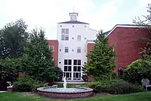 The Teachout-Cooley Library of Hiram College was erected in 1900 with money given by Abram Teachout, a nineteenth-century Cleveland lumber merchant.[2] Built of brick and wood, consisting of two stories with a three-story tower. In 1923, a supplemental gift from the Teachout family made possible an addition built to the south of the original building, and joined to it by means of a vestibule. The addition of a Greek portico entrance doubled the size of the Library. An observatory with its telescope, a gift of Christian minister Lathrop Cooley,[3] was a prominent feature of the building until 1939. The observatory was relocated to its present site on Wakefield Road thanks to the generosity of Ella M. Stephens.[1]