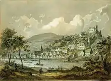 Hirschhorn (Hirtzhorn) was surrounded by a town wall after the brothers Hans V, Albrecht and Eberhard of Hirschhorn had received its town charter from King Wenceslaus in 1391. When Elector Palatine Ruprecht III was elected King in 1400, Hans V of Hirschhorn was employed in Imperial service as an adviser, diplomat, and financier. His diplomatic missions also took him to the English court. King Henry V of England held Hans in such high esteem that he granted him a lifelong annual payment of 100 marks.[4]