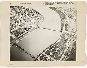 April 1904 saw the collapse of the rail bridge due to spring melt and ice on the South Saskatchewan River.[3] The Grand Trunk Pacific Railway system survey proposed Hanley as its northern terminal between Regina and Prince Albert.[4] Saskatoon's Board of Trade sent delegates from Saskatoon to Ottawa to discuss the river crossing and proposed city bridges. Their mission resulted in the selection of Saskatoon as the divisional centre for both the Canadian Pacific Railway and the Grand Trunk Pacific Railway; both of these built bridges near the town by 1907.[3] The QLL&SR bridge was rebuilt in 1905, and again after a train fell through it in March 1914; it was demolished in 1965 to make way for the Senator Sid Buckwold Bridge and the Idylwyld Freeway.[5]
