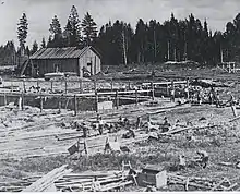 A specific feature of the Ural mining plants was the obligatory presence of a dam and a pond, which ensured the operation of factory mechanisms through water wheels. Therefore, mining plants were built in close proximity to ore deposits and the river.[88] In a drought, when the water level in the navigable river decreased, the passage of ships was ensured by the synchronous discharge of water from several factory ponds located on the tributaries. The supply of charcoal was provided by the vast forest dachas assigned to the factories. The length of the dams of large factories reached 200–300 m and more (the largest dam of the Byngovsky plant was 695 m long), the width was 30–40 m, and the height was 6–10 m.[89] Due to the climatic conditions of the Urals, it was necessary to maintain a large volume of water in the pond in order to avoid it freezing in the winter. The complete dependence of factories on the availability of water in the ponds led to frequent shutdowns of enterprises or their individual shops for a period of up to 200 days a year.[90] To increase the water pressure, various methods were used: connecting ponds through channels with lakes or other ponds, replenishing ponds from high-mountain reservoirs through gutters.[91] Another difference from European dams was the presence of pine or larch log cabins with valves to regulate the water level in the pond. A wide (up to 10 m and more) slot or "Veshnyak"[note 7] served to let in excess water during spring floods or in summer after heavy rains. A narrower (about 2 m wide) working slot was intended to supply water to a water conduit - a wooden trough, which was laid along the entire length of the plant's territory and through which water was supplied by a system of wooden pipes and gutters to the impellers of numerous plant mechanisms. The dams of large factories had several slots. All production buildings were located along the working slots. At the same time, industries that required more energy to drive mechanisms were located closer to the dam. Directly behind the dam there was usually a blast-furnace shop, behind it - blast factories, further along the trough there were drilling, stacking, steel, armature and auxiliary factories. The blast furnace was connected to the dam by a bridge across which ore, coal and fluxes were delivered. Almost all the Ural mining plants of the 18th century had two blast furnaces in their composition; in the future, the number of furnaces could increase. Pig iron, as a rule, was sent to a blast factory, where it was processed into blast iron and pounded with hammers. At large factories, the number of hammers reached 8-13.[93][94][95][96][97]