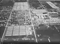 By the end of March, 1942, all ethnic Japanese residents on Bainbridge Island had been removed and sent to the Manzanar camp in California.[30] Most of the remaining 9,600 Japanese Americans from the Seattle area were forced to live behind barbed wire in converted livestock stalls and parking lots on the Puyallup Valley Fair grounds for several months while the War Relocation Authority oversaw the construction of longer term concentration camps further inland.[33] The temporary assembly center in Puyallup was given the name Camp Harmony.[34] Because of the internment, many members of the Japanese community permanently lost their businesses and residences.[35] Most members of the Seattle area Japanese community that had been incarcerated at Camp Harmony were sent in groups by rail to the Minidoka Relocation Center in Idaho later in 1942, following the completion of that camp's construction.[36]