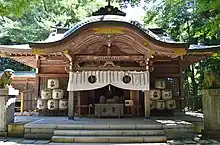 It enshrines the kami Izanagi (伊弉諾尊), Ōkuninushi (大国主尊), Susanoo-no-Mikoto (素戔嗚尊), Ninigi-no-Mikoto (瓊々杵尊), Omiyanome (大宮比売尊), and Futsunomitama (布留大神).