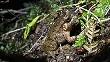 Hochstetter's frog has a brown-green to brown-red top with dark bands and warts, yellow-brown bellies. Males grow to 38 mm (1.5 in) and females 50 mm (2.0 in) snout–vent length. They are nocturnal, staying under refugia during the day. Hochstetter's frog prefers moist gaps under shaded debris, like rocks and logs and along streams and seepages in native temperate rainforest.[6] They are carnivorous, preying on invertebrates such as spiders, beetles, and mites.[7] All native New Zealand frogs (pepeketua in Māori) share tail-wagging muscles, inscriptional ribs, round pupils, and a lack of eardrums, eustachian tubes, and vocal sacs. These frogs, in some ways more similar to salamanders than modern frogs, use chemical signals over acoustic signals to mark habitat and recognize competitors.[8] Hochstetter's frogs poor hearing is complemented by their lack of vocalization.