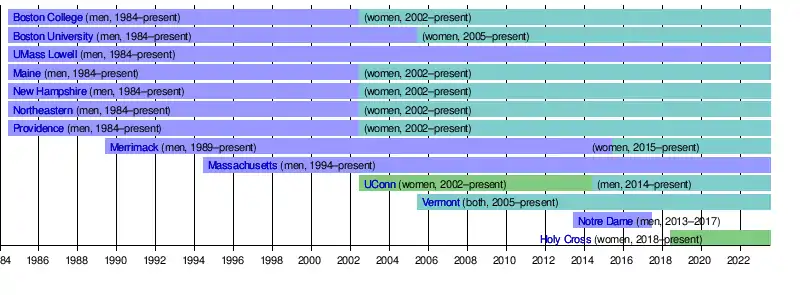 Hockey East came into existence in 1984 for men's hockey when most of its current members split from what is today known as ECAC Hockey, after disagreements with the Ivy League members.[2] The women's league began play in 2002.[3][4]