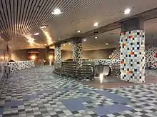 Hollywood/Western station has a single island platform oriented east–west under Hollywood Boulevard, with a mezzanine above. The single station entrance and elevator are located in a plaza on the southeast corner of the intersection.[4] The station was designed by Escudero–Fribourg Architects, while May Sun designed the interior finish and artworks, which reflect the neighborhood's immigrant heritage.[5] The walls and floors are covered by black, gray, and white tiles, with colorful highlights on the walls.[6] Armenian, Chinese, and Mayan symbols are depicted on granite pavers. Some wall panels display historic photographs of the neighborhood; others have depictions of fossils discovered during excavation of the station.[5] Sculptures of two Pacific Electric Red Cars hang over the platform from the mezzanine wall.[7]
