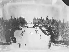 Following the 1891 season, the lease with the land owner for Husebybakken needed to be renegotiated. Several times the venues had had too little snow and Fritz Huitfeldt and Hans Krag proposed building a new hill at Besserudmyra. After half a year of planning, the general assembly of the Association for the Promotion of Skiing approved the move in late 1891.[3] To create sufficient water supply for the hotels, a dam had been built and this created Besserudtjernet, a small lake, at the bottom of the hill. It would cover with ice during the winter.[4] Construction was simple: a few trees had to be chopped down and when the snow came, branches were laid where the jump was to be.[5] The first competition was held on 30 January 1892, and was spectated by between fifteen and twenty thousand people,[6] who saw jumpers reach 15 to 21.5 meters.[7][8]