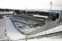 In 2002, the Association for the Promotion of Skiing and the city started the process of applying for the FIS Nordic World Ski Championships 2009.[26] The city council decided to grant NOK 52.8 million to upgrade Holmenkollen, including Holmenkollbakken, for the 2009 World Championships.[27] Oslo lost the vote in the International Ski Federation (FIS) against Liberec, Czech Republic, on 4 June 2004. The Norwegian Ski Federation subsequently stated that they would apply for the 2011 World Championships.[28] The Association for the Promotion of Skiing stated that they wanted a new hill in Rødkleiva instead of expanding the existing ski flying hill in Vikersund, Vikersundbakken. Holmenkollbakken would then be used for the last time as a large hill during the 2011 World Championships, and would then converted to a normal hill.[29] In May 2005, the general assembly of the Norwegian Ski Federation voted to build a new ski flying and normal hill in Rødkleiva ahead of the 2011 World Championships.[30] Following Vikersundbakken being awarded the FIS Ski-Flying World Championships 2012 in 2008, the general assembly of the Norwegian Ski Federation that year decided to terminate the plans for a ski flying hill in Rødkleiva.[31]