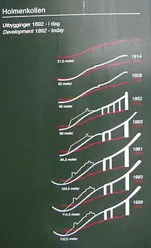 During the 1910s it had become common in the United States to build jumps with a scaffold superstructure for the in-run, and this had been described as an abomination in the Norwegian press. Prior to the 1914 season, a 10-meter (33 ft) tall steel superstructure was built.[5] This resulted in massive negative reactions in the press, and it was the public's opinion that ski jumping was to be done in natural hills. The same year, two other major Norwegian hills received similar structures, Nydalsbakken and Solbergbakken. The first trials were made on 15 January, giving jumps 34 meters. This was regarded as the furthest anyone would jump.[11] The hill was subsequently expanded slightly a few times afterwards, including blasting it steeper, chopping it wider, and covering the landing slope with earth and sowing grass to improve the profile.[12]