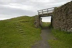 Nessend Quarry and much of the eastern tramway are visible on navigable maps.[Notes 7] From Sandham southwards the third waggonway was on an embankment all the way to the castle, visible on satellite view, map view, on photographs[41] and on the ground. In 2014 it formed the foundation of a well maintained public footpath. The lime kilns at the castle have been preserved and are maintained by the National Trust. The grade-separated trackbeds for bringing coal from the 1861–83 jetties and limestone from Nessend and taking finished product to the jetties can be inferred from the software and from images in the line's standard work,[42] as well as on the ground.[Notes 8] In 2016 evidence of the jetties at the castle was still plain to see.[43][44]