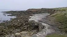 The scale of operations and infrastructure associated with St Cuthbert's Limeworks represented a step change on centuries of practice; Nessend Quarry and Lower Kennedy represented a further leap, but also a business error. Nessend Quarry was safe from the sea and more economical to work than Coves and Acre Quarries,[17] though the damage to the caves in the limestone was criticised by at least one writer.[20] A waggonway connecting it to the 1846 jetty a short distance south of St Cuthbert's Limeworks was first shown on an Admiralty chart dated "c1855".[21]