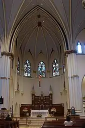 There are currently 21 stained glass windows at the cathedral. The most renowned ones are the five windows made by Canadian artist Guido Nincheri. They depict Our Lady of the Holy Rosary, the Baptism of Our Lord, Jesus Healing the Sick, Jesus with the Children and the Assumption. The window showing Our Lady of the Holy Rosary featured on Canada Post's annual Christmas stamp in 1997.[43] Furthermore, the Institute for Stained Glass in Canada documented the stained glass windows at the cathedral.[44]