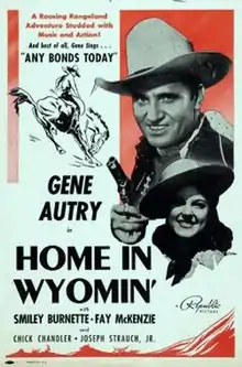 Home in Wyomin' is a 1942 American Western film directed by William Morgan and starring Gene Autry, Smiley Burnette, and Fay McKenzie.[1][2] Based on a story by Stuart Palmer, the film is about a singing cowboy who helps out a former employer in trouble with his failing rodeo while romancing a woman reporter.[1] In Home in Wyomin', Autry sang his hit songs "Be Honest with Me", "Back in the Saddle Again", and "Tweedle O'Twill", as well as Irving Berlin's "Any Bonds Today", becoming the first major star to sing the official song of the U.S. Defense Bond campaign during the war.[1]