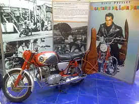 In the 1964 film Roustabout, Elvis Presley rode a CB77 Super Hawk, rather than the Harley-Davidsons Presley would later be associated with, because Paramount Pictures wanted to avoid motorcycles' outlaw image that had originated in media coverage of the 1947 Hollister riot and the 1953 film The Wild One, especially given Presley's scandalous televised hip gyrations.[5]:42[6] Honda had cultivated a nonthreatening, wholesome image with their "You meet the nicest people on a Honda" advertising campaign, so the CB77 was ideal to make Presley's film persona seem just rebellious enough, but not too much.[5]:42[6] The film, coinciding with the 1964 Beach Boys song "Little Honda", was free publicity for Honda in the early years of establishing their brand in America.[5]:42