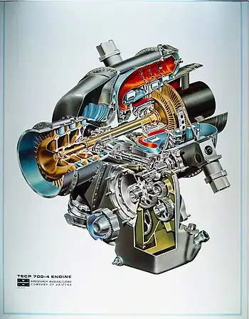 A small geared turbofan named Garrett TFE731 was developed from TSCP700, borrowing its internal parts. It was successfully marketed for business jets and military trainer aircraft.[1]