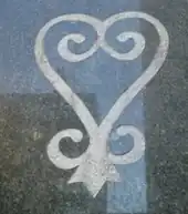 Both Central and West African symbolism has been observed in African American quilt-making. African American women made quilts incorporating the Bakongo cosmogram and West African crosses.[176] For example, an African American woman named Harriet Powers made quilts using Bakongo and other West African symbols. On one of Harriet Powers quilts was a cross with four suns showing Bakongo influence quilting the Kongo cosmogram onto her quilts. Other African symbols were seen in Powers quilts. However, scholars suggests Harriet Powers cross symbols may also be a West African cross, as West Africans also had crosses as symbols, but the meaning and use of crosses in West Africa was different from the Bakongo people in Central Africa. Fon influence and artistic style was seen in Powers quilts as well. Harriet Powers was born enslaved in Georgia in 1837, and scholars suggest Powers may have been of Bakongo or Dahomean descent.[177][178] African-American quilts are influenced by American quilt making and West African designs. Adinkra symbols and other African symbols are sewed into fabrics for spiritual purposes. Quilt makers in the African American community also sewed mojo bags and placed roots, bones, and other items inside bags for protection. Another example, was Louiza Francis Combs. Louiza Francis Combs was born in Guinea and came to the United States in the 1860s. Her quilts incorporate West African features of "a red striped pattern, patchwork, and two broad asymmetrical panels." This pattern design is similar to the Mande peoples religious concepts that evil spirits travel in a straight path, and to protect one's self from evil spirits broken lines and fragmented shapes are sewn into fabrics and quilts.[179] Some of the meanings of the African symbols sewed into quilts were held secret. Scholars suggests some of the African American women who made quilts might have been in a secret society that retained the true spiritual meanings of the symbols seen in their quilts. Only initiates trained in quilt making received the spiritual meanings of the African symbols. Some of the symbols mention the crossroads, the Kongo cosmogram, and the ancestors. Certain colors are used in quilts to protect from evil and invoke ancestral spirits. Scholars interviewed an African American quilt maker in Oregon and have found Yoruba inspirations in her quilts. Her quilts looked similar to the Egungun regalia patterns of the Yoruba people in West Africa, where she incorporated "striped-piecing techniques that pay tribute to her ancestors."[180]