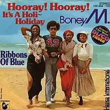"Hooray! Hooray! It's a Holi-Holiday" is a 1979 single by German Euro disco band Boney M. as an adaptation of nursery rhyme "Polly Wolly Doodle". Despite breaking their row of 7 consecutive German #1 singles, peaking at #4, the single was a big hit all over Europe, peaking at #3 in the UK. The song and its B-side, "Ribbons of Blue", were taken from the movie Disco Fever. "Ribbons of Blue" has a strong country feel with the addition of a pedal steel guitar. Even though the single cover announced the arrival of the next Boney M. album, Oceans of Fantasy, it would still be another six months before the album was released, and of the two songs, only "Ribbons of Blue" (penned by the group's drummer, Keith Forsey) was included and just in a one- or two-minute edit, depending on the pressing.