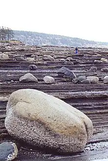 Fossil collectors have found Ammonite and Baculite fossils at Boulder Point on Hornby Island.[4] A species of saurodontid fish (previously considered a pterosaur) called Gwawinapterus beardi was identified based on a fossil found on a beach on Hornby Island.[5]