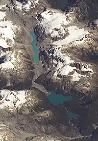 The three main bodies of water in the park are Pinto Concha Lake 4.75 km2 (2 sq mi), Cabrera Lake 1.55 km2 (1 sq mi) and Inexplorado Lake 1.5 km2 (1 sq mi).[1] Pinto Concha is the most visited attraction in the park.[2] There are six main rivers in the park. Inexplorado Lake is one of a series of paternoster lakes that form part of the Blanco River drainage basin. The aforesaid lakes are characterized by distinctive blue and green hues, due to rock flour suspended in their waters and give to the river its milky appearance. Negro River is another major river system in the park.