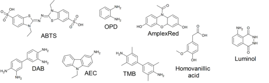 Numerous substrates for horseradish peroxidase have been described and commercialized to exploit the desirable features of HRP. These substrates fall into several distinct categories. HRP catalyzes the conversion of chromogenic substrates (e.g., TMB, DAB, ABTS) into colored products, and produces light when acting on chemiluminescent substrates (e.g. Enhanced Chemiluminescence by luminol).