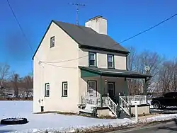 The house consists of a basement, which formerly served as a kitchen, and two stories with two rooms each, front and back. The exterior walls are stuccoed stone, the two interior walls are made of simple wooden planking. A steep winding stair centered on the west wall ascends from the basement to the second story. Each of the above-ground rooms has a fireplace, which are now closed off. Electricity and a furnace were installed in the house about 1950. A porch leads to the front (south) entrance. A door on the north wall leads to the basement.