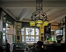 In 1994, the building was thoroughly renovated and made a center for Czech art and culture. After further renovation works between 2002 and 2003, the building was made home to the Museum of Czech Cubism, operated by the Prague Museum of Decorative Arts. The second and third floors are dedicated to a permanent exhibition of Cubist art, while the upper floors are used for temporary exhibitions and workshops. Although few original plans had survived, black-and-white photographs documenting the café's interior décor from 1912 were used during renovation. Replicas of café furniture and brass chandeliers were constructed to revive the café and showcase Czech cubism to customers.[3][4]