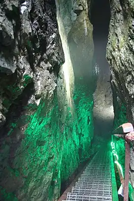 The tourist attraction called the Hoverberg Cave (Hoverbergsgrottan) is 170 m (560 ft) deep, and is the largest rock cave in Scandinavia.[4] It was discovered 1897 by Jöns Väst, a Swedish-American.[5] 81 m (266 ft) of the cave is accessible to visitors. Less known is the Fissure (Rämnan), a large ravine in the mountain with a length of about 400 m (1,300 ft)[6] and a depth of about 25 m (82 ft), that is visible from the west and even from the county highway (länsväg) 321. According to a folk tale, a giant called the Old Man of Hoverberg Lad (Hoverbergsgubben) resided in the cave, but he moved out when people began to tidy the cave.[5]