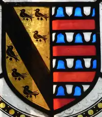 Arms of Sir Hugh Luttrell (c.1364-1428) (Or, a bend between six martlets sable) impaling arms of Beaumont of Shirwell, Devon, (Barry of six vair and gules, here shown incorrectly as barry of eight), the family of his wife Catherine Beaumont (d. 1435). Detail from 19th century Luttrell heraldic stained-glass windows, south wall of Dunster Church