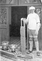 On Sunday 30 December, he arrived in St Moritz to begin a Swiss convalescence. Boredom saw him take up bobsleighing as it did not require much use of his legs. Initially he was prone to leave the run and end up in the snow, but after some days of practice he usually managed to stay on track. It was during a heavy crash from the Cresta Run that his spine was somehow readjusted, enabling him to walk freely immediately after regaining consciousness. Around a week later, he won the St. Moritz Tobogganing Club's Freshman and Novices' Cups for 1901, a remarkable triumph for a man who had been unable to walk unaided only a few days before.[27][28]