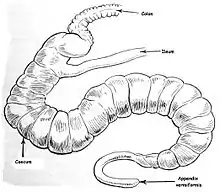 Some herbivorous animals, such as rabbits, have a terminal vermiform appendix and cecum that apparently bear patches of tissue with immune functions and may also be important in maintaining the composition of intestinal flora. It does not however seem to have much digestive function, if any, and is not present in all herbivores, even those with large caeca.[12] As shown in the accompanying pictures however, the human appendix typically is about comparable to that of the rabbit's in size, though the caecum is reduced to a single bulge where the ileum empties into the colon.[7] Some carnivorous animals may have appendices too, but seldom have more than vestigial caeca.[13] In line with the possibility of vestigial organs developing new functions, some research suggests that the appendix may guard against the loss of symbiotic bacteria that aid in digestion, though that is unlikely to be a novel function, given the presence of vermiform appendices in many herbivores.[14][15] Intestinal bacterial populations entrenched in the appendix may support quick re-establishment of the flora of the large intestine after an illness, poisoning, or after an antibiotic treatment depletes or otherwise causes harmful changes to the bacterial population of the colon.[16]