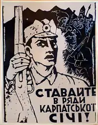 In addition, Sich soldiers who surrendered to the Poles were shot on the spot, and natives of Eastern Galicia (part of the Polish Republic at the time), who were detained by the Hungarian occupiers in Transcarpathia, were handed over to the Polish border service. Part of the Carpathian Sich fighters, who had retreated to the Kingdom of Romania, were disarmed, looted by the local population and handed over to the Hungarians. The Sich survivors were held in a Hungarian concentration camp in the village of Voryulyuposh near the town of Nyíregyháza.[17] In the first two months after the occupation, 59,377 people from Transcarpathia were deported to work in the Kingdom of Hungary, and 686 people were deported to Germany.[6]
