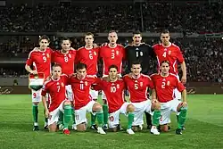 The Hungary national under-20 team head coach Sándor Egervári was appointed as head coach for the senior side ahead of Euro 2012 qualifying in which Hungary were drawn against Finland, Moldova, the Netherlands, San Marino and Sweden.[58] Hungary won six, drew one and lost three games as they finished the group in third place with 19 points. During the qualification process, in September 2011, Hungary reached the 27th place in the FIFA World Ranking, their highest position to date.[59] At the end of the year, the national team played Liechtenstein as a commemoration of the recently deceased Flórián Albert,[60] the only Hungarian football player to win the Ballon d'Or.