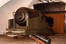 The work eventually cost £211,000; it began in 1861, with the majority of the work being completed by 1870 and the additional iron shielding by 1874.[67][lower-alpha 2] In peacetime, the castle held around 131 officers and men but it would have needed to be substantially reinforced during wartime if all the weapons were to be manned.[68] Although the fort never received its full complement of guns, by 1881 it had ten 12.5 inch, 38 ton (317 mm, 39,000 kg) rifled muzzle-loading (RML) guns, fifteen 10 inch, 18 ton (254 mm, 18,000 kg) RML guns, five 9 inch, 12 ton (228 mm, 12,000 kg) RML guns, and 3 64-pounders (29 kg), together forming a powerful arsenal.[69]