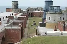 The East Wing is relatively unaltered since its construction.[109] It is approximately 150 metres (490 ft) long, with 24 heavy gun positions and two main magazines; on the roof is the original gun directing position and a Bofors gun position added during the Second World War.[110] It is reached through a gateway in the north-east bastion.[82] Just beyond the East Wing are three 6-pounder quick-firing gun emplacements from 1893, which were fed ammunition from the wing through a hole in the outer wall.[71]