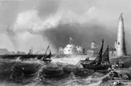 The castle fell into neglect, and reports from the 1770s through into the early 1790s noted extensive problems, complaining that the fort's guns could no longer be mounted on the dilapidated bastions and that water was seeping through the decaying walls.[38] By 1793, the castle was considered to be "in the worst condition" of all the forts along the coast, and all its guns were unusable.[39] Repairs were authorised, but little was actually done.[38] The spit around the castle began to be used by civilians, including fishermen and gardeners; a lighthouse, called the Hurst Tower, was built there in 1786, and the Shipwright's Arms inn was established alongside the castle.[40]