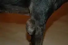 A hygroma, or a false bursa, is a discrete, fluid-filled sac that can form on the joints of dogs in response to repeated pressure, such as that from sitting on a hard surface.[1] It is treated by draining the fluid and may be prevented by providing padded bedding.