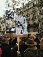 French comedian and political activist Dieudonné M'bala M'bala likened himself to Amedy Coulibaly on Facebook, commenting that "I feel like Charlie Coulibaly."[54][55] As a result, he was detained and questioned by the French police.[55] Moreover, Paris prosecutor started a legal investigation due to his alleged "defense of terrorism".[55][56][57][58] The French Prime Minister, Manuel Valls, stated, "Racism, antisemitism and the defense of terrorism are crimes," adding, "One should not confuse freedom of opinion and antisemitism."[59] Moreover, Bernard Cazeneuve, the Interior Minister, called Dieudonné's remark "contemptible".[57] The Conseil représentatif des institutions juives de France (CRIF) also denounced Dieudonné's comment, and called for French theatres to block him from performing.[58]