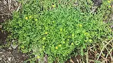 Hypericum humifusum is a low-growing, hairless perennial. The thin trailing stems have two raised lines and bear opposite pairs of pale green elongated oval leaves, often with tiny translucent glands. The undersides of the leaves have tiny black dots on the edges. The flowers are about 1 cm (0.3 in) across and grow from the leaf axils. There are five sepals of unequal size and five yellow petals, often with a few black dots, and not much larger in size than the sepals. The stamens are united at the base into bundles. The fruits are dry.[2][3]