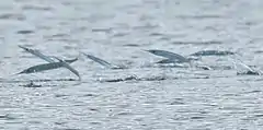 Due to the garfish's localised schooling behavior, they attract bigger species of fish and mammals such as the kingfish (Morrison, Lowe, Spong & Rush, 2007) and dolphins.[13] The schooling behavior of garfish also exposes them to heavy predation from sea birds such as gannets, shags and penguins. However, it is unlikely that garfish would be predated on by all three seabird species at once. The species of seabird that the garfish is subject to predation from is heavily dependent on whereabouts in the marine environment they are. Garfish schooling in shallow harbor areas are likely to be predated upon by shags, while garfish schooling in more open, deeper waters will more likely become prey for gannets/penguins.[6]